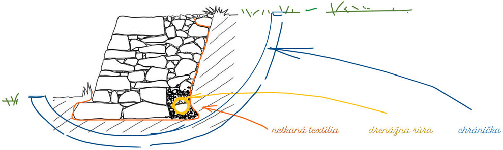 V závislosti od podmienok môžeme použiť aj drenážnu rúru, ktorú umiestnime k prvému radu múrika, zo strany od svahu.