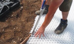 Každá rohož má nalisovanú geotextíliu (68 g/m2 ), s presahom nadvoch stranách. Rohože pokladáme tak, aby bunky rohože dosadali tesne k sebe a presahy textílie prekrývajte. Maximalizujeme tým stabilitu.