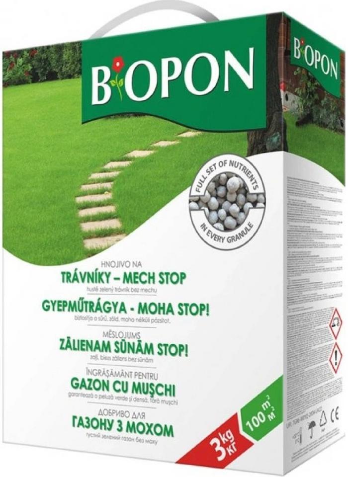 Bopon hnojivo na trávniky - proti machu je moderné, viaczložkové hnojivo určené pre starostlivosť o trávniky. Jeho starostlivo vyvinuté zloženie zaisťuje tráve správny rast, hustotu a sýto zelenú farbu. Zvýšený obsah železa znemožňuje rozvoj machu a zabraňuje jeho šíreniu. Dusík obsiahnutý v hnojive urýchľuje zarastanie prázdnych miest trávou.