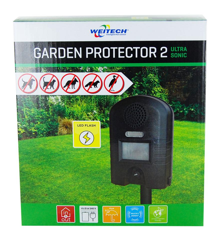 Weitech WK0052 Garden Protector 2 je výkonný exteriérový odpudzovač, ktorý kombinuje ultrazvukovú technológiu so stroboskopickým bleskom na ochranu pozemkov do 200 m2 pred túlavými zvieratami a divou zverou. Vďaka infračervenému detektoru pohybu a siedmim nastaviteľným frekvenčným režimom poskytuje cielené a energeticky úsporné riešenie proti psom, mačkám, kunám či volavkám.