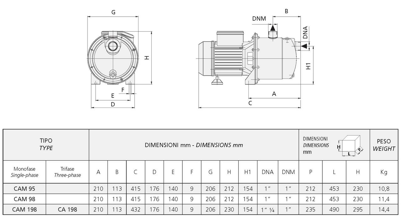 Povrchové čerpadlo Speroni CAM 198 predstavuje výkonnejší variant v rade celonerezových samonasávacích čerpadiel typu JET. Tento model sa vyznačuje kompletnou konštrukciou z nehrdzavejúcej ocele AISI 304, pričom tento materiál je použitý na plášti čerpadla aj na obežnom kolese. S motorom o výkone 1,1 kW dosahuje výtlak až 56 metrov (5,6 bar), čo ho predurčuje pre aplikácie s vyššími nárokmi na tlak. Zväčšené sacie hrdlo (1 1/4") zabezpečuje efektívnejšie nasávanie vody a stabilný výkon.