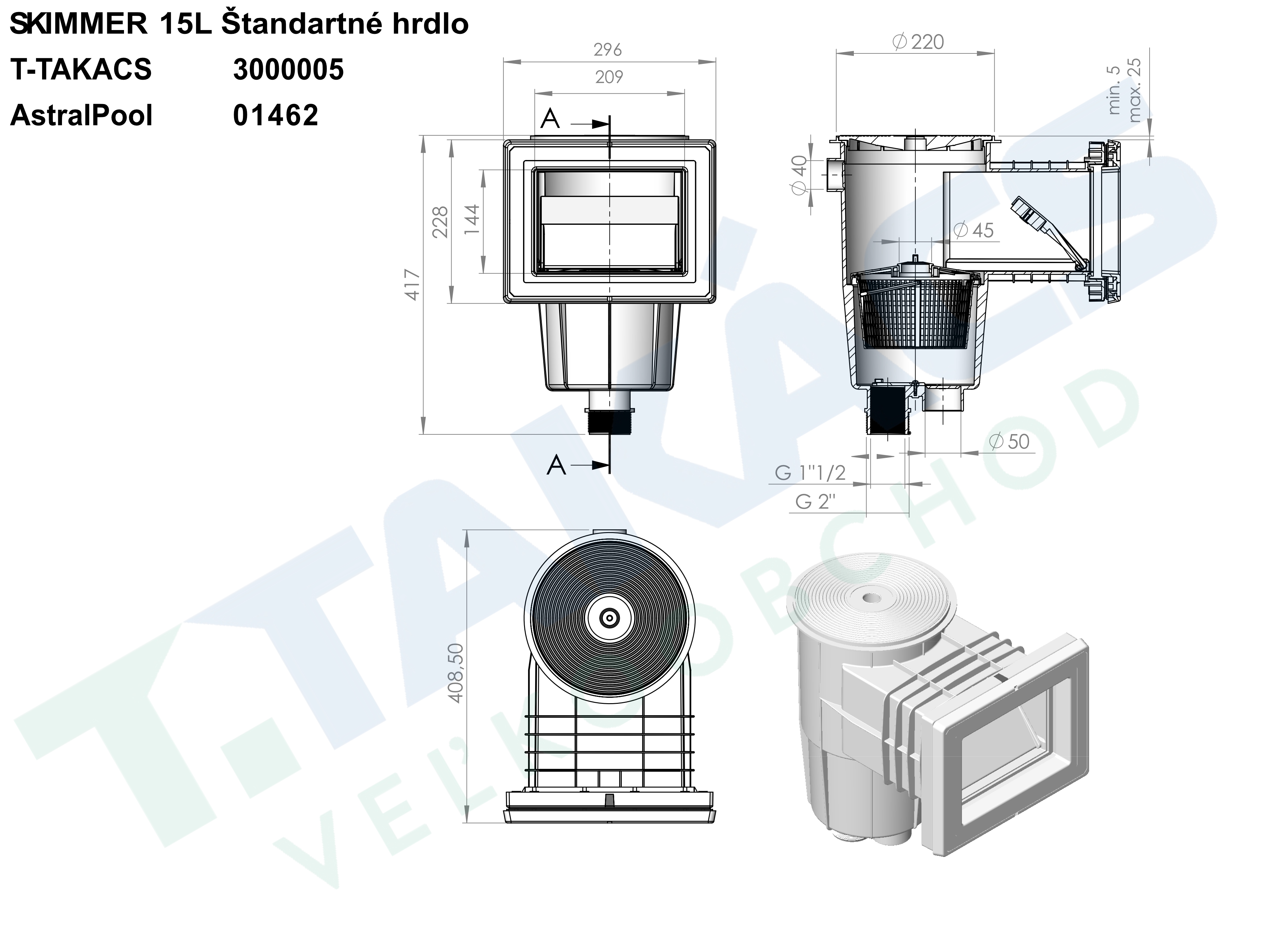 - Univerzálne použitie: Tento skimmer je vďaka priloženým tesneniam a prírube vhodný pre široké spektrum bazénov – od tých s bazénovou fóliou (ťažká fólia aj "bag"), až po plastové či laminátové skelety.