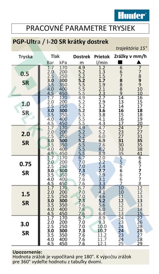 Poznámka: Všetky úhrny zrážok sú vypočítané pre prevádzku pri 180 stupňoch (polkruh). Pre úhrn zrážok pre postrekovač s plným kruhom (360 stupňov) vydelte hodnotu 2.