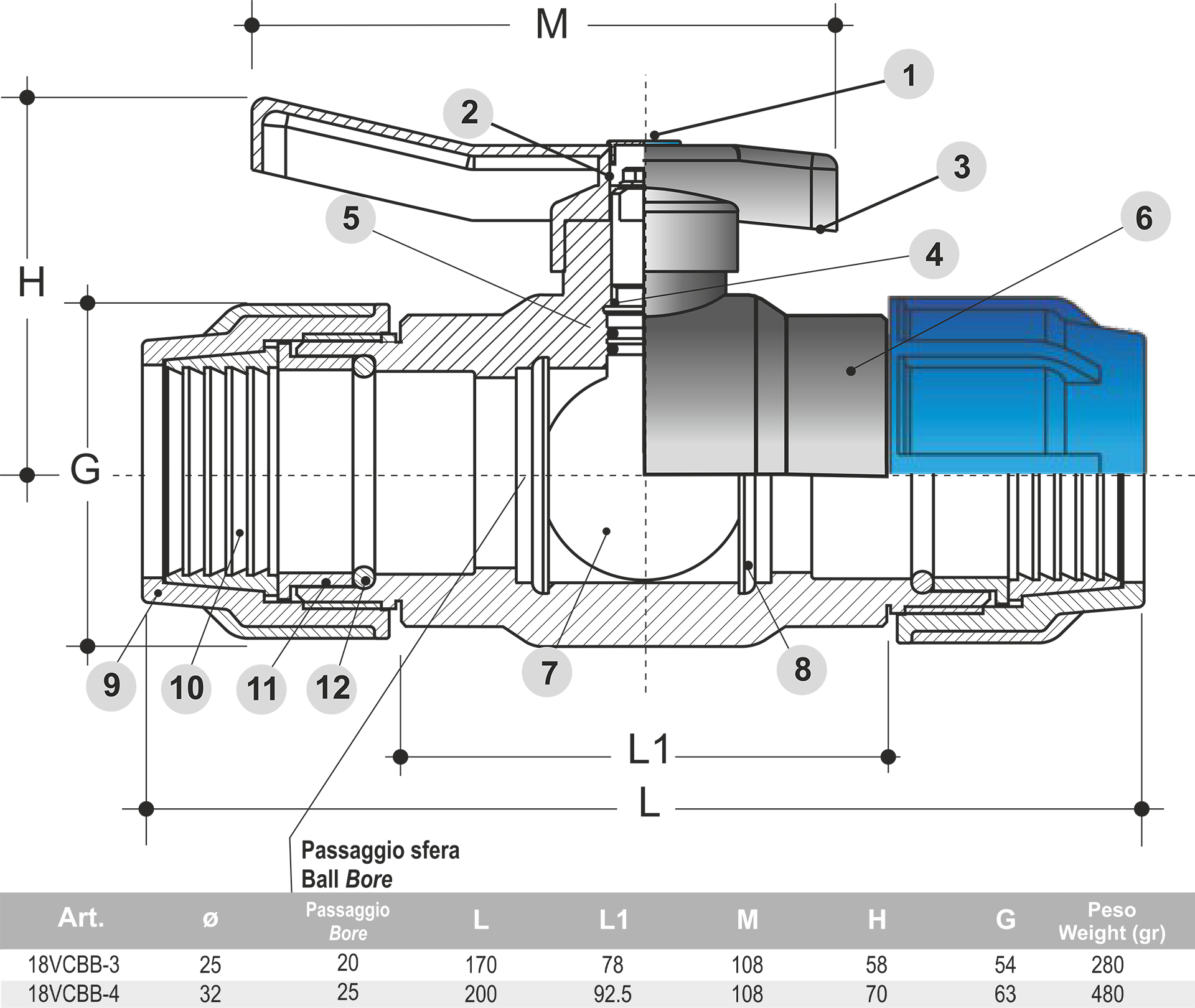 PP guľový ventil páka 32 mm, PN16