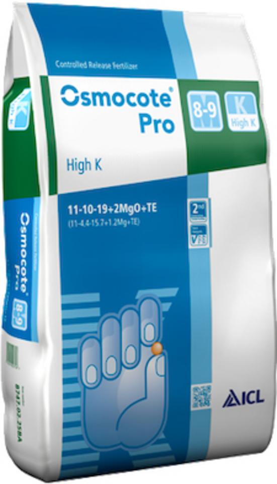 ICL Osmocote Pro High K 8-9M je hnojivo 2. generácie s riadeným uvoľňovaním živín a dobou pôsobenia 8-9 mesiacov. Je určené pre črepníkové rastliny, ktoré vyžadujú výživu s vysokým obsahom draslíka, alebo v situáciách, keď závlahová voda obsahuje vysoký podiel dusíka. Podporuje dobré vetvenie a kompaktný rast rastlín.