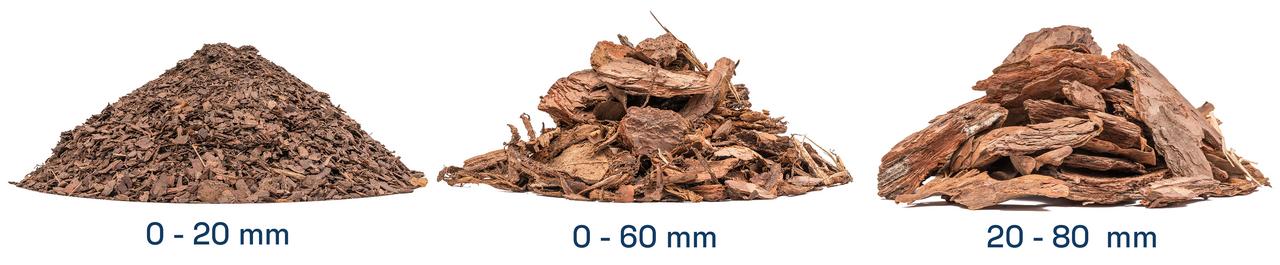 Frakcia 0–60 mm je deklarovaný rozsah veľkosti častíc. V balení je prevažne frakcia 30–60 mm — jemnejšie čiastočky vznikajú pri preprave a manipulácii mechanickým trením kúskov kôry.