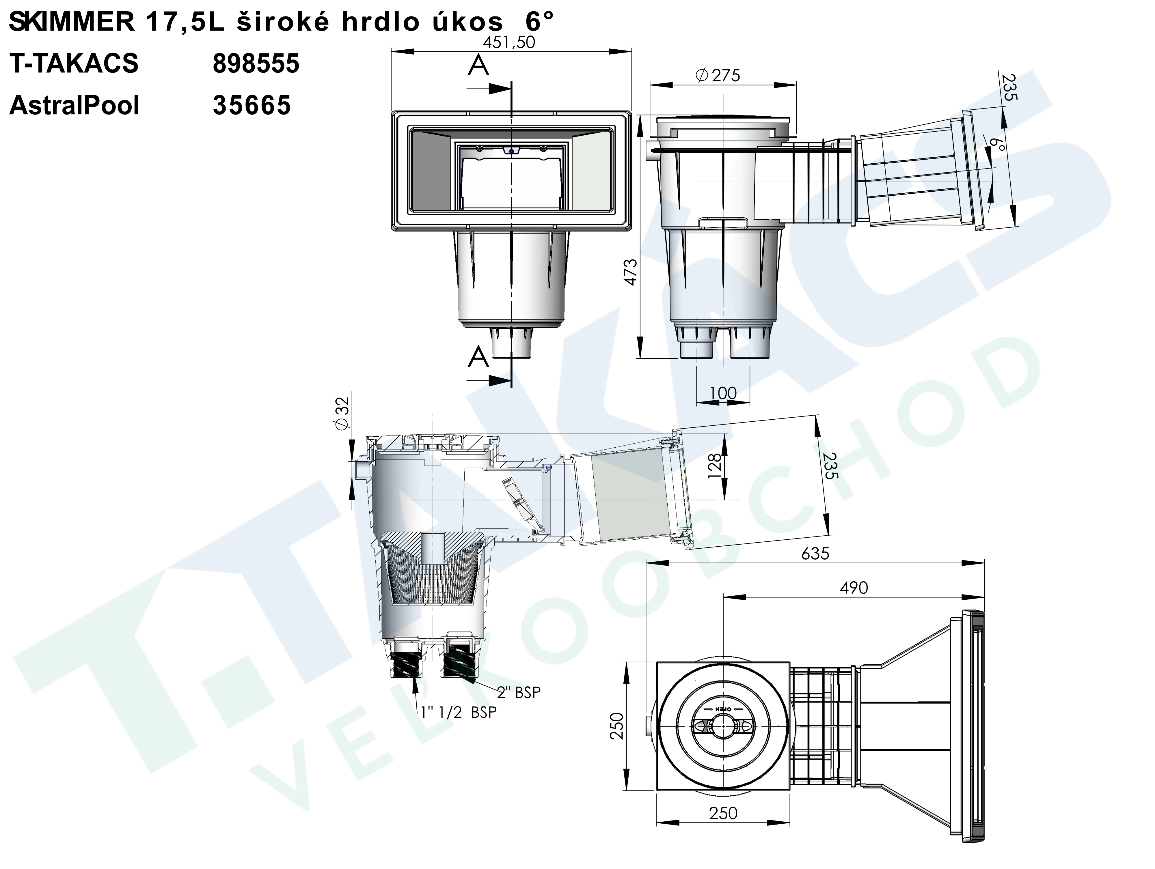 - Špeciálny 6° úkos: Integrovaný sklon hrdla eliminuje potrebu vyrábať atypické tesnenia alebo klinové podložky. Skimmer presne "sadne" do šikmého výrezu v stene bazéna.