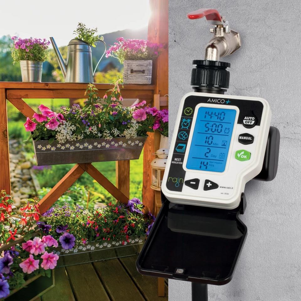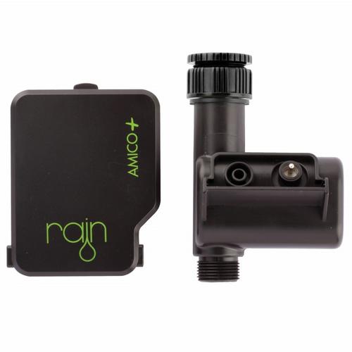 Rain AMICO+ je jednokanálový batériový časovač závlahy kategórie tap timer od talianskeho výrobcu Rain S.p.A. Zariadenie sa nasadzuje priamo na štandardný vodovodný kohútik so závitom 3/4" alebo 1" a zabezpečuje plnohodnotnú automatickú závlahovú funkciu bez potreby elektrickej prípojky. Odnímateľná riadiaca jednotka umožňuje programovanie, výmenu batérií a servis solenoidového ventilu nezávisle od ventilového tela — bez demontáže celej zostavy z kohútika. Zariadenie disponuje 3-palcovým podsvietený displejom, ktorý zobrazuje celý harmonogram závlahy jedným pohľadom, a nestratnou pamäťou zachovávajúcou program aj po výmene batérií.