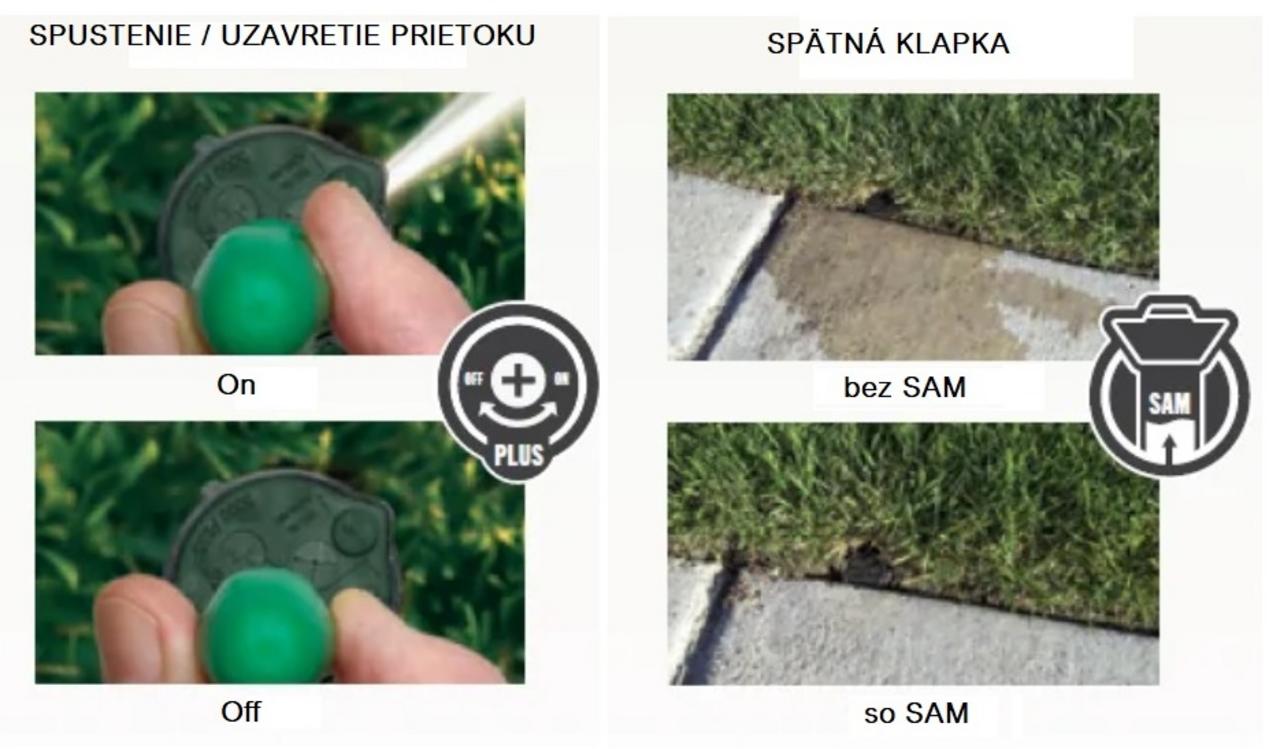 • Funkcia Flow Shutoff (Plus): Umožňuje vypnúť a zapnúť postrekovač priamo na jeho hlave, čo zjednodušuje údržbu a preplachovanie zóny.