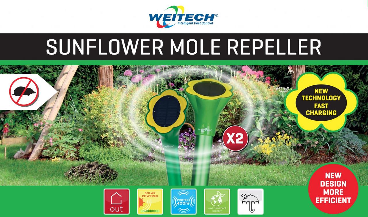 Weitech WK2018 (balenie 2 ks) je inovatívny solárny odpudzovač krtkov a hrabošov, maskovaný ako dekoratívna slnečnica. Zariadenie využíva kombináciu nepravidelných zvukových a vibračných impulzov na ochranu plochy až 400 m2. Vďaka solárnemu napájaniu je energeticky sebestačné, bezúdržbové a ekologické, pričom nenarúša vzhľad okrasnej záhrady.