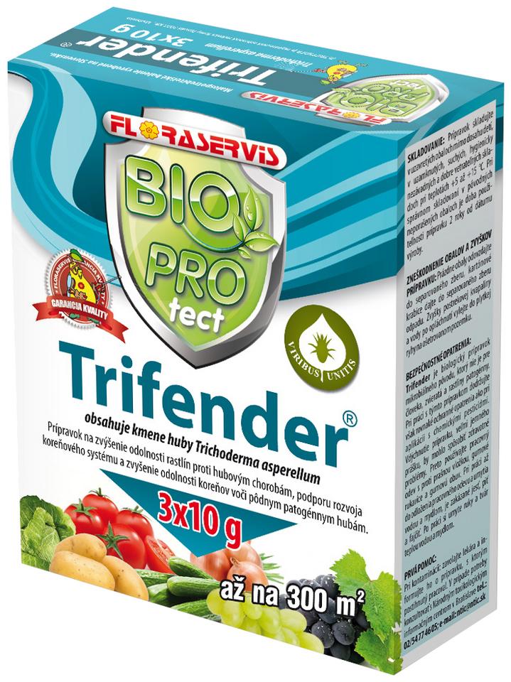 Trifender (3 x 10 g) je biologický prípravok s obsahom hyperparazitickej huby Trichoderma asperellum, ktorá chráni koreňový systém pred pôdnymi patogénmi a stimuluje rast rastlín. Aplikácia do pôdy zvyšuje odolnosť voči chorobám (Pythium, Fusarium), zlepšuje príjem živín a zväčšuje koreňovú hmotu. Je ideálny pre zeleninu, trávniky a okrasné rastliny v ekologickom režime.