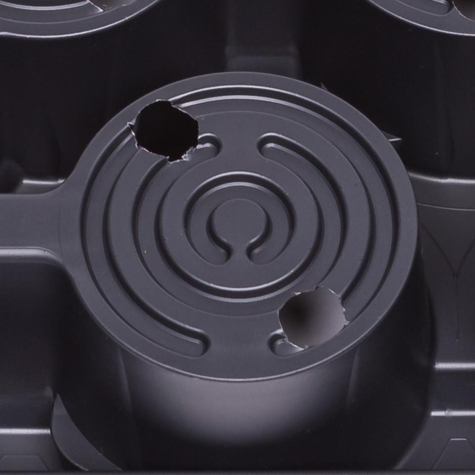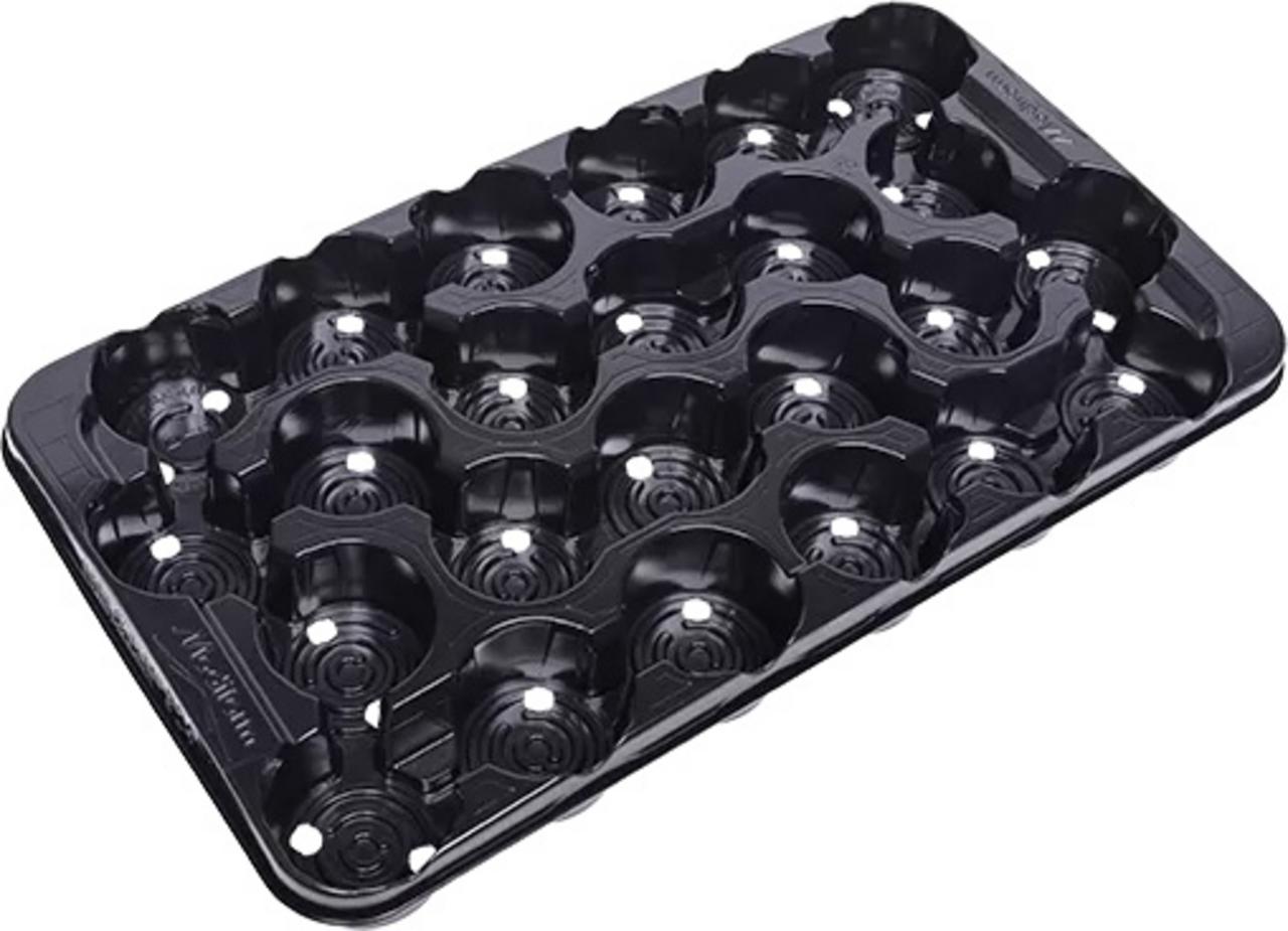 Čierne transportné pláto Modiform 3324 Normpack 324 pre 24 ks okrúhlych kvetináčov s priemerom 9 cm. Každá bunka je na dne opatrená dvomi dierami s priemerom 12,7 mm pre bezpečný odtok vody.