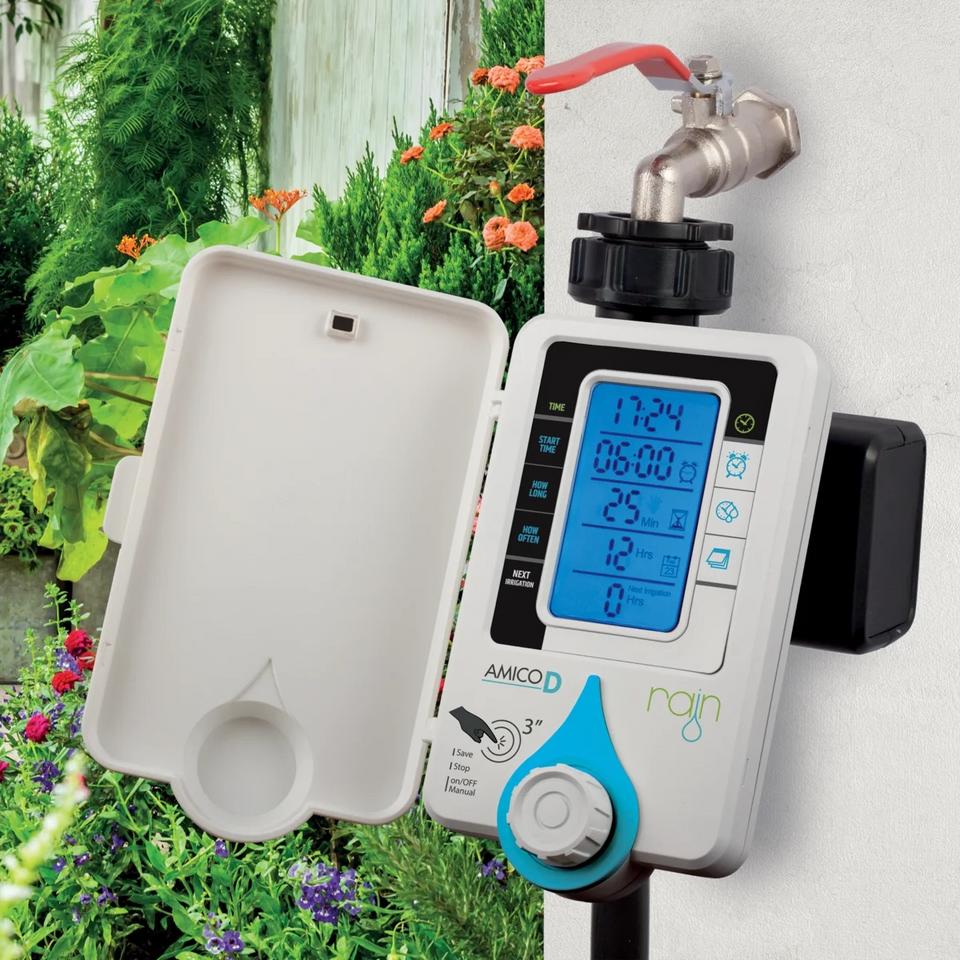 Rain Amico D je kompaktná ovládacia jednotka talianskej značky Rain s.p.a., navrhnutá na priame naskrutkovanie na štandardný záhradný ventil so závitom 3/4" alebo 1". Prístroj ovláda jeden zavlažovací okruh a celý harmonogram závlahy — čas spustenia, dĺžku závlahy a frekvenciu opakovania — zobrazuje na podsvietenom displeji s uhlopriečkou 3". Program zostáva uložený aj pri výmene batérií.