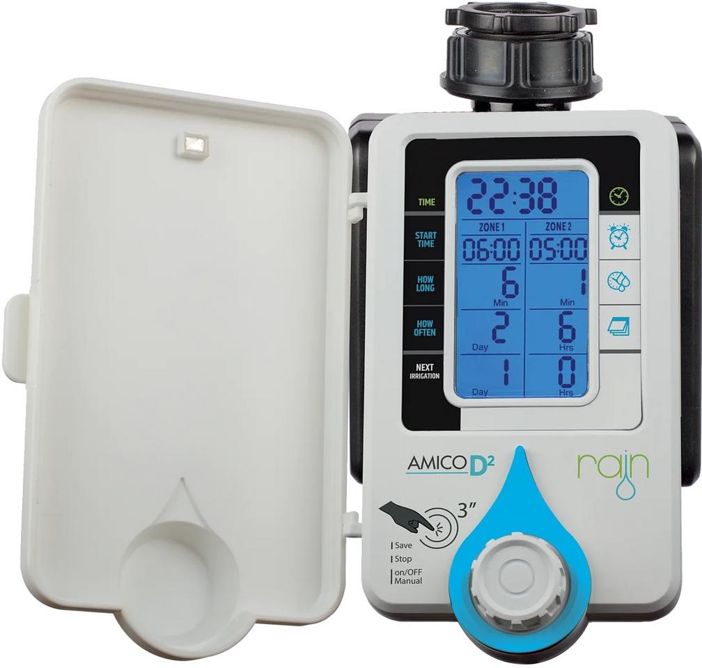 Rain Amico D2 je kompaktný batériový programátor závlahy talianskej značky Rain s.p.a., určený na priame naskrutkovanie na štandardný záhradný výtok so závitom 3/4" alebo 1". Na rozdiel od jednozónovej verzie Amico D riadi prístroj dva zavlažovacie okruhy (Zone 1 a Zone 2) s plne nezávislými nastaveniami — každý okruh má vlastný štartovací čas, dobu trvania a frekvenciu opakovania. Oba harmonogramy sú zobrazené súčasne na podsvietenom 3" displeji, čo umožňuje okamžitú kontrolu celého plánu závlahy. Program zostáva uložený aj pri výmene batérií.