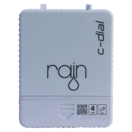 Rain C-Dial je kompaktná nástenná riadiaca jednotka určená na interiérovú montáž, navrhnutá pre automatické závlahové systémy rodinných domov a menších záhrad. Ovládač je k dispozícii vo variante so 4 alebo 6 závlahovými zónami a ovláda 24 VAC elektromagnetické ventily s normálne zatvoreným solenoidom. Napájanie zabezpečuje externý transformátor 220 VAC / 24 VAC s výkonom 0,8 A (súčasť dodávky), zálohovanie programov pri výpadku elektrickej energie 2 alkalické batérie AA 1,5 V (nie sú súčasťou dodávky).