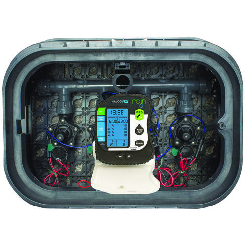 Rain AMICO PRO 2 je vysokoodolný závlahový ovládač konštruovaný pre priamu inštaláciu do ventilových šácht. Zariadenie disponuje stupňom ochrany IP68, čo zaručuje úplnú vodotesnosť, čím predchádza poškodeniu elektroniky v extrémne vlhkom prostredí. Unikátna modulárna konštrukcia s odnímateľnou riadiacou jednotkou umožňuje technikom vykonávať programovanie alebo výmenu 1,5 V AA batérií bez nutnosti manipulácie s celým ventilovým rozvodom. Systém riadi 9 V DC bistabilné (latching) solenoidy a vďaka funkcii "One Look Display" poskytuje okamžitý prehľad o harmonograme oboch sekcií na jednom 3-palcovom podsvietenom displeji. Energeticky nezávislá EEPROM pamäť zaisťuje trvalé uchovanie dát aj pri úplnom vybití napájacích zdrojov.