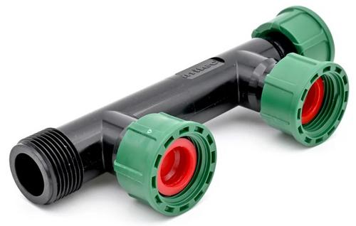 Kompaktný 2-T rozdeľovač z PVC v jednoliatom bloku pre profesionálnu montáž 1" elektromagnetických ventilov. Umožňuje rýchlu a beznástrojovú inštaláciu vďaka prípojkám s prevlečnými maticami (holendrami) s O-krúžkami.