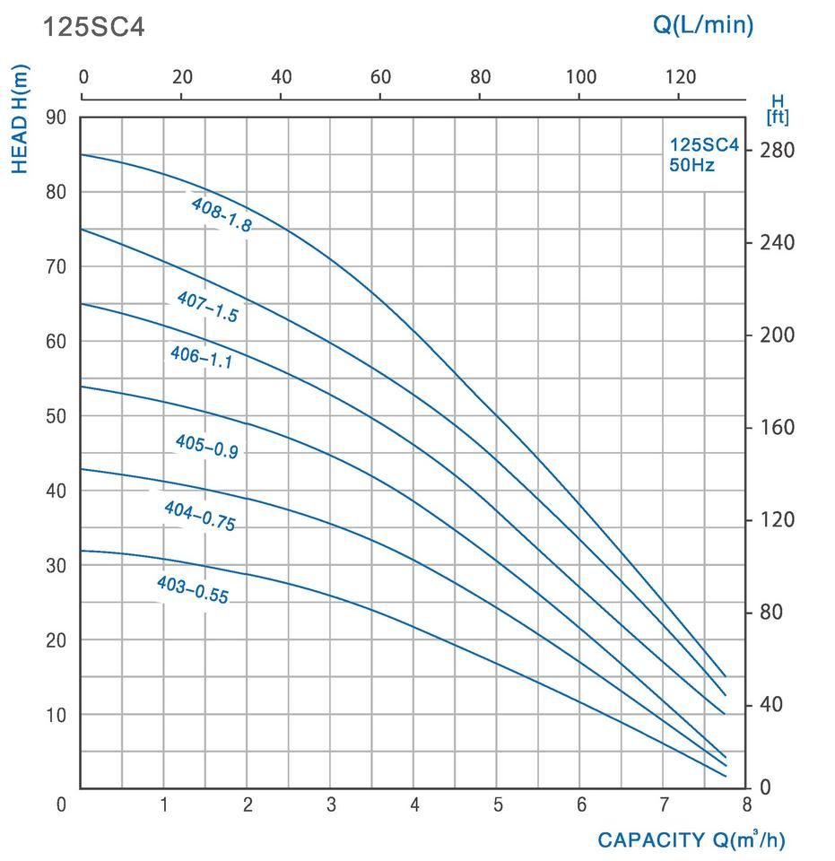 Ponorné čerpadlo JIADI 125SCM405A predstavuje zosilnenú verziu v rade 5-palcových čerpadiel, navrhnutú pre aplikácie vyžadujúce kombináciu vysokého objemu vody a dostatočného tlaku. S motorom o výkone 0,9 kW dosahuje výtlak 54 metrov a maximálny prietok až 130 l/min (7,8 m3/h). Vďaka väčšiemu priemeru (127 mm) je čerpadlo robustnejšie a disponuje efektívnejším chladením, čo ho predurčuje na inštaláciu do kopaných studní, zberných nádrží a širších vrtov. Konštrukcia z nehrdzavejúcej ocele AISI 304 a technopolyméru Noryl zaručuje dlhodobú odolnosť a bezúdržbovú prevádzku.