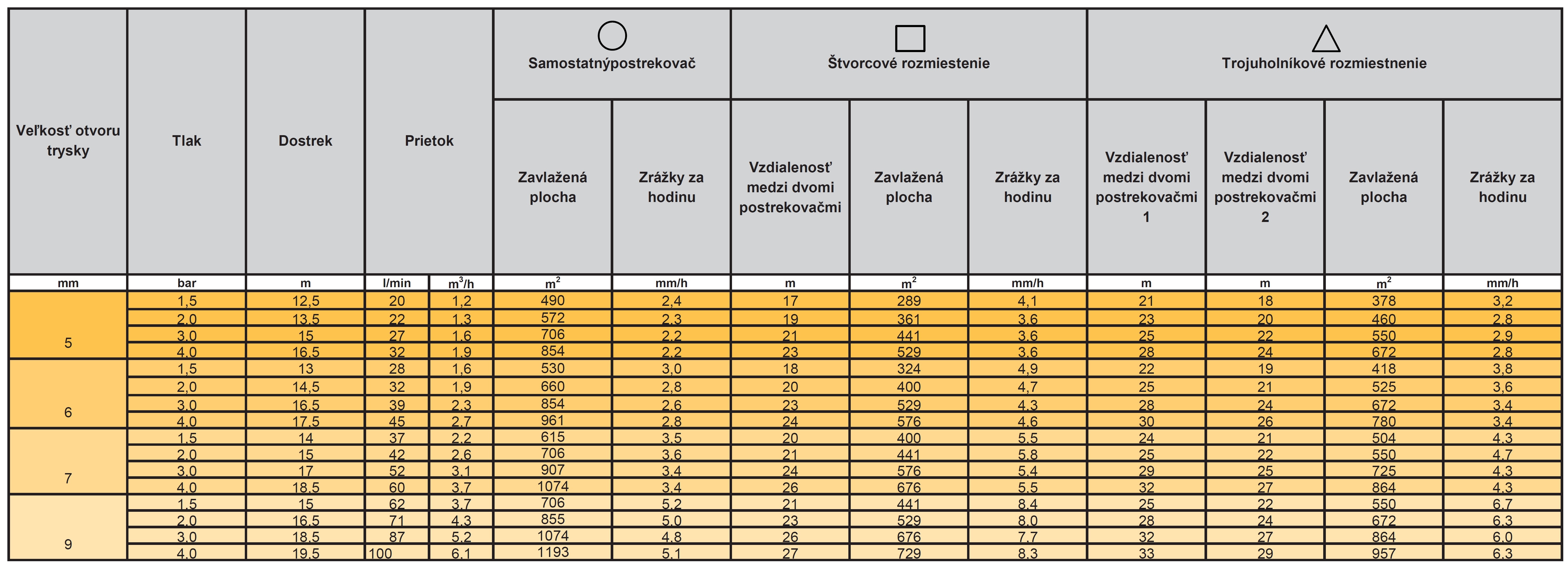 - Dostrek 12,5–19,5 m. Pri tryske 9 mm a tlaku 4 bar dosahuje postrekovač radius 19,5 m a prietok 100 l/min.
