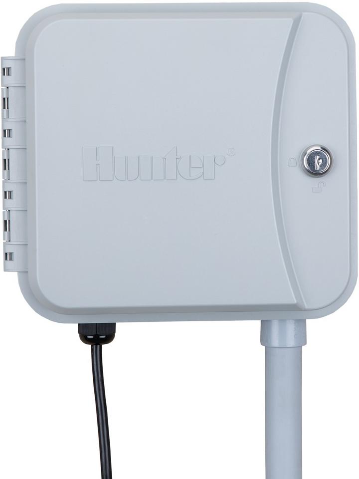 Modulárna riadiaca jednotka Hunter P2C-401-E pre inštaláciu v interiéri alebo exteriéri. V základe má model P2C-401-E možnosť ovládať 4 sekcie, pomocou modulov je však rozšíriteľná až na 23 sekcií (event. 32 sekcií s použitím dekodérového modulu Hunter PC-DM a Hunter EZ dekodérového systému).