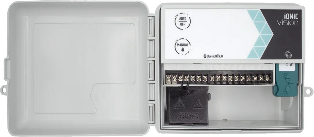 Rain riadiaca jednotka IONIC VISION OUTDOOR je externý nástenný ovládač s interným transformátorom, ktorý poskytuje flexibilné programovacie možnosti (EASY, PRO, ONE-BY-ONE) a bezdrôtové ovládanie cez Bluetooth 5.0 a voliteľné Wi-Fi s Nuvola Mini. Je ideálnym riešením pre efektívnu a spoľahlivú správu zavlažovacích systémov.
