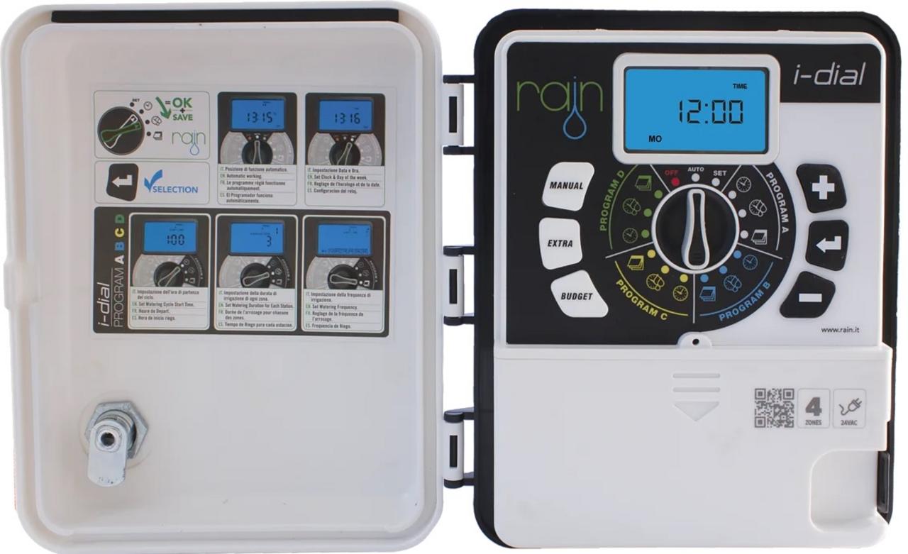 Rain I-Dial Outdoor je séria vonkajších riadiacich jednotiek určených na automatické ovládanie závlahových systémov s 24 VAC solenoidovými ventilmi. Jednotky sú dostupné v 4 konfiguráciách: 4, 6, 8 a 12 zón. Každý model disponuje 4 nezávislými programami (A, B, C, D) s jedným štartovacím časom na program, čo umožňuje prevádzkovať až 4 závlahové cykly denne. Nastaviteľná doba zavlažovania na zónu je 1 – 240 minút v 1-minútových krokoch.