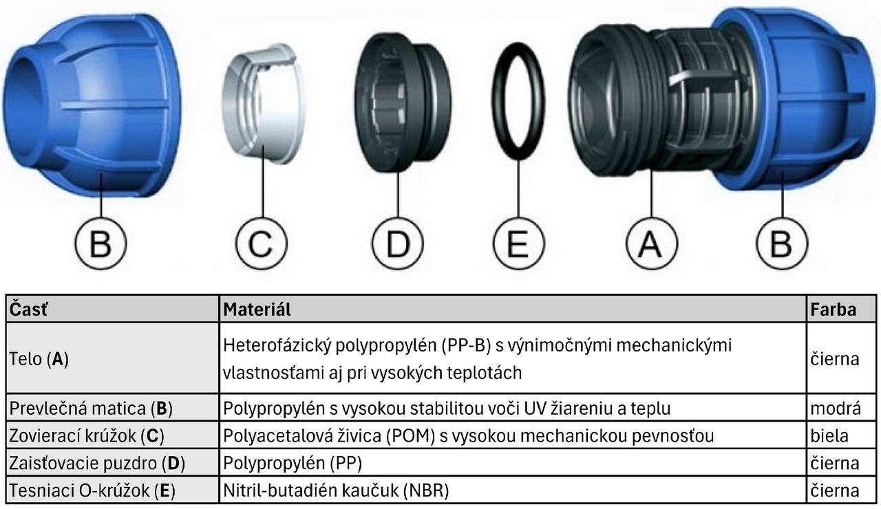 PLASTICA ALFA rada Blue Line kompresné tvarovky vyrobené z termoplastu. Určené pre PE rúry, pre rozvody vody pod tlakom. Jednoduchá a rýchla montáž. Tlaková rada PN16 pre tvarovky do priemeru 110mm, s výnimkou tvaroviek s vnútorným závitom 3" a 4", ktoré sú PN10. Tvarovky sú vhodné pre civilný sektor, agro sektor a priemyselné odvetvie. Z dôvodu zachovania tlakovej odolnosti sú tvarovky určené pre transport vody s teplotou do 20°C!