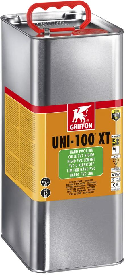 Pri realizácii veľkých projektov, ako sú aquaparky, hlavné prívody vody alebo priemyselné kanalizácie, je 5-litrové balenie lepidla Griffon UNI-100 XT nevyhnutnosťou. Toto lepidlo bolo chemicky upravené tak, aby poskytlo inštalatérom to najcennejšie pri práci s veľkými priemermi – čas. Na rozdiel od bežných lepidiel schne pomalšie (označenie XT = Extended Time), čo umožňuje natrieť obrovské plochy rúr a tvaroviek a následne ich zasunúť do seba skôr, než lepidlo začne tuhnúť. Vedro zabezpečuje dostatočnú zásobu materiálu pre kontinuálnu prácu.