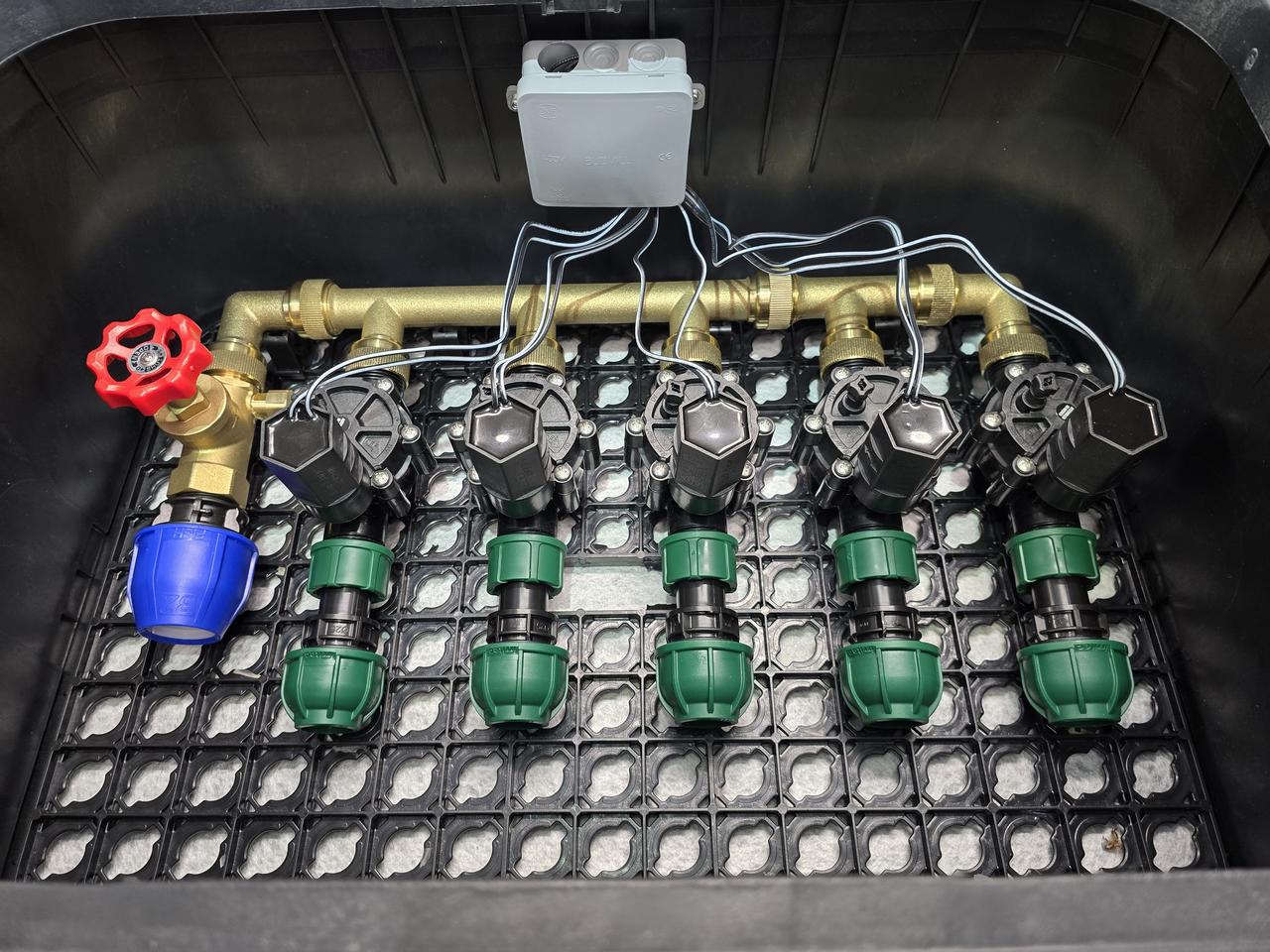 READYBOX Profi Rain Bird predstavuje dokonalé riešenie pre profesionálne zavlažovacie systémy. Obsahuje všetky komponenty pre okamžité pripojenie, čím šetrí čas a znižuje náklady na inštaláciu. Tento predinštalovaný set ventilovej šachty Rain EzOPEN Jumbo je dodávaný už s predvŕtanými otvormi. Pevný plastový rošt na dne šachty slúži ako organizátor a chráni pred vniknutím krtov. Geotextília na dne a po obvode šachty zabraňuje prenikaniu zeminy. Set obsahuje pripájacie kompresné tvarovky pre PE hadice, pre vstup pripravená je 32 mm tvarovka a na výstupe pre sekcie sú pripravené 25 mm tvarovky. Vodotesná elektrická inštalačná krabica s páčkovými svorkami zjednodušuje zapojenie elektromagnetických ventilov. Ako hlavný uzáver vody slúži 1" sedlový ventil s odvodnením a rozdelenie vody zabezpečuje mosadzný holendrový rozdeľovač. Šachta je dodávaná s piatimi elektromagnetickými ventilmi Rain Bird 100-DV-MM 24VAC.