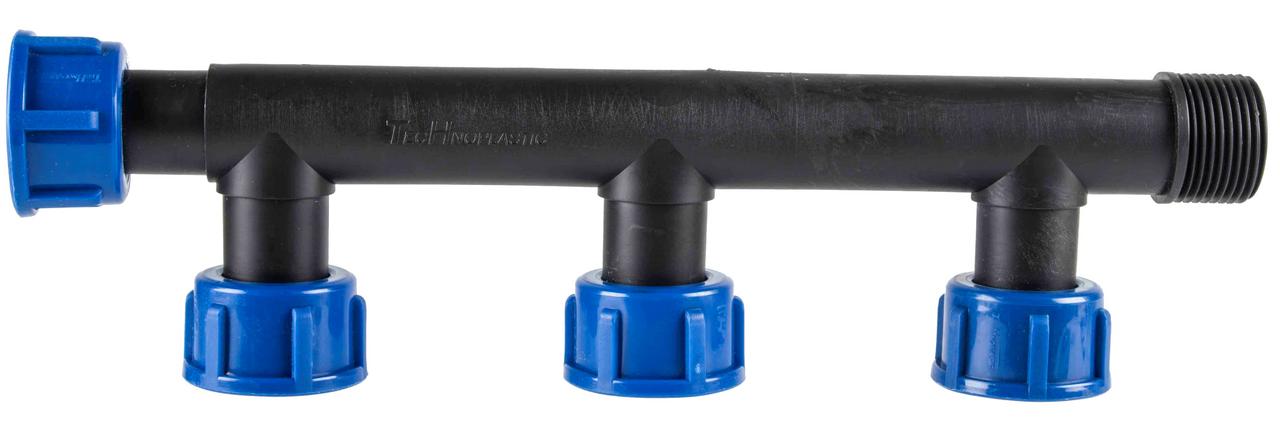 Holendrový rozdeľovač s plochým tesnením 3 x T-kus 1” s prevlečnou maticou s F závitom. Určený pre pripojenie 1" elektromagentických ventilov s M závitom. Konfigurácia rozdeľovača 3 + 1 F závit / 1 x M závit. Rýchla inštalácia bez nutnosti teflónového tesnenia.
