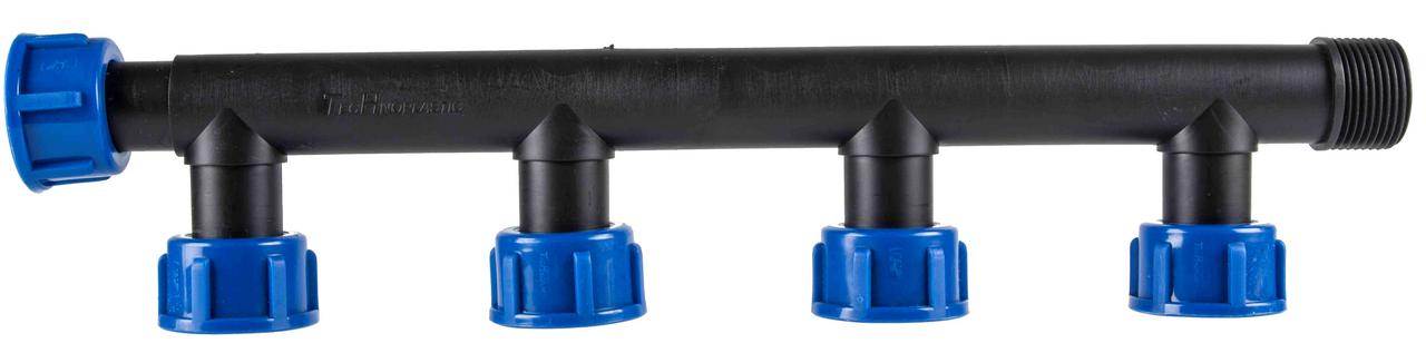 Holendrový rozdeľovač s plochým tesnením 4 x T-kus 1” s prevlečnou maticou s F závitom. Určený pre pripojenie 1" elektromagentických ventilov s M závitom. Konfigurácia rozdeľovača 4 + 1 F závit / 1 x M závit. Rýchla inštalácia bez nutnosti teflónového tesnenia.