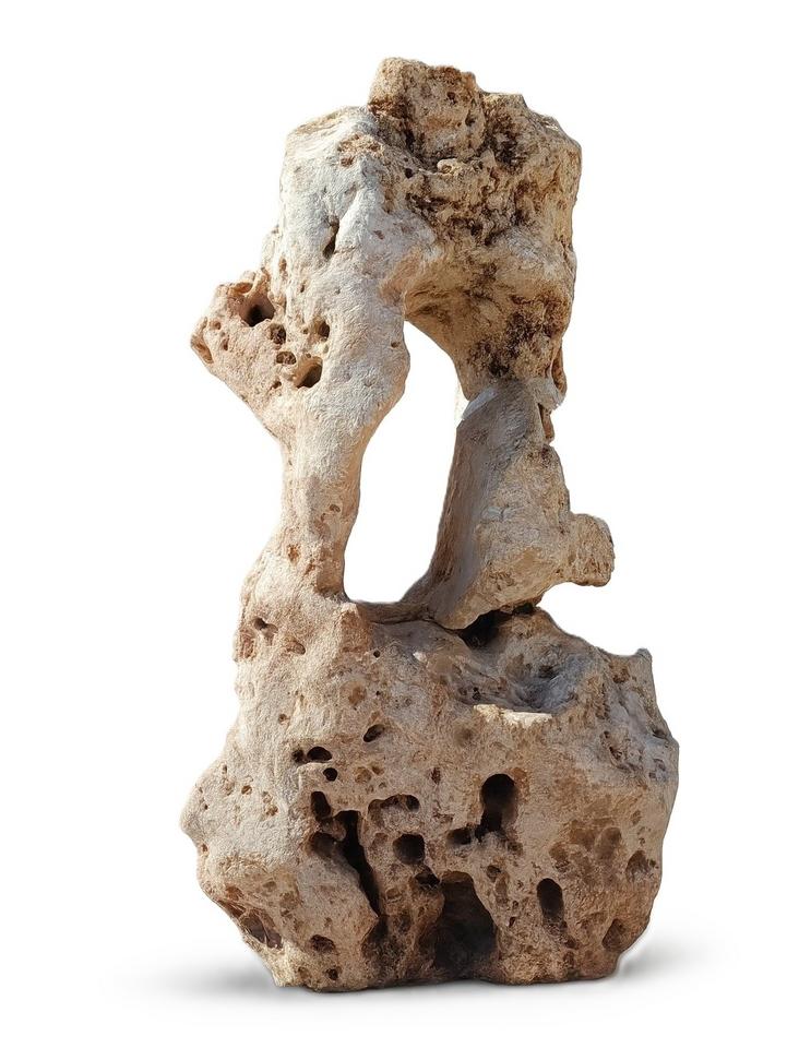 Tento ručne vyberaný solitérny kameň, často z travertínu alebo pieskovca, je jedinečný vďaka svojej mohutnej dierovanej štruktúre a nepravidelnému tvaru. Jeho piesková farba a početné otvory vytvárajú zaujímavé vizuálne a svetelné efekty. Kameň je podpílený (má rovný rezaný základ) pre ľahkú a stabilnú inštaláciu. Vďaka svojej nízkej náročnosti na údržbu a vizuálnej sile je ideálny ako centrálny bod každého dizajnu.