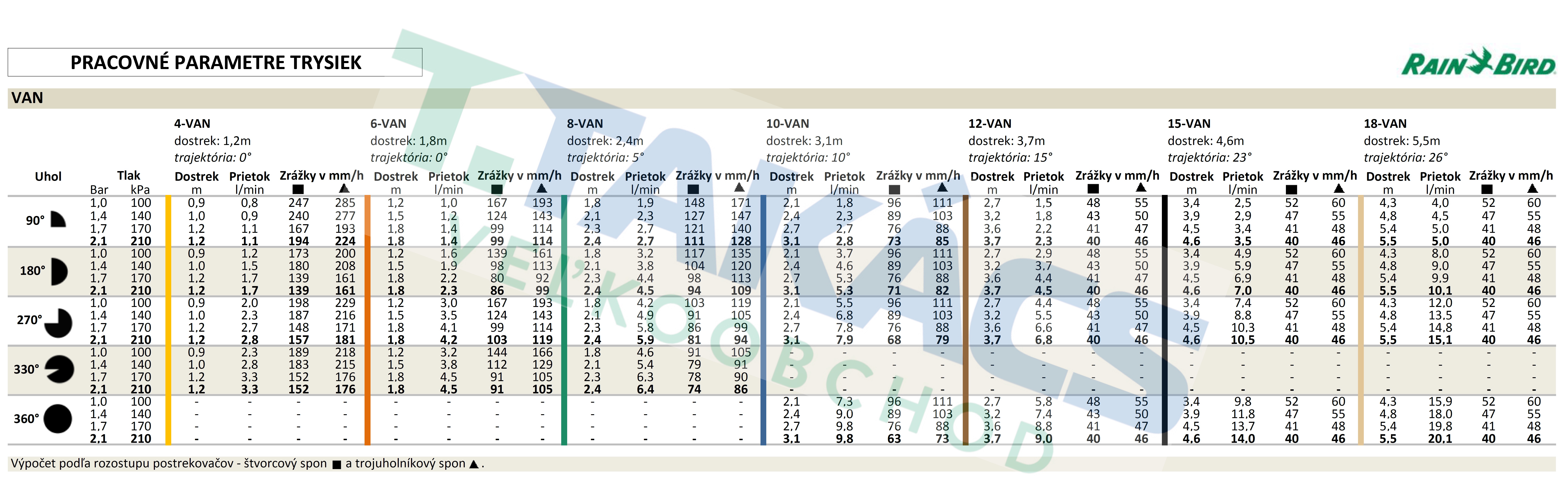 Rain Bird UNI SPRAY-418 VAN variant s béžovou tryskou 18-VAN dosahuje polomer 4,3 až 5,5 m.