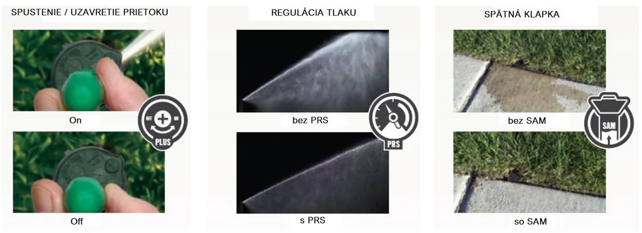 Ďalej je vybavený integrovaným spätným ventilom Seal-A-Matic™ (SAM), ktorý je účinný až do prevýšenia 2,1 m a zabraňuje vytekaniu vody z najnižšie položených postrekovačov. Pre maximálnu životnosť je tento model vybavený nerezovým výsuvníkom (SS - Stainless Steel Riser), ktorý ho chráni pred mechanickým poškodením a poškriabaním od piesku.
