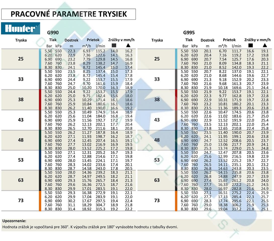 Pre maximálnu efektivitu je regulátor tlaku v hlave postrekovača (pri modeloch E a D) presne kalibrovaný podľa veľkosti inštalovanej trysky: