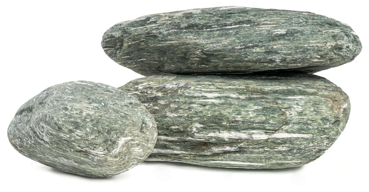 Dekoračný omieľaný kameň Green Angel zo zeleného mramoru s bielymi pásmi a škvrnitou farbou, ideálny pre vytvorenie pokojnej a harmonickej atmosféry v exteriéri.