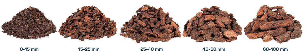- Trvanlivosť 4–5 rokov. Najhrubšia frakcia sa rozkladá extrémne pomaly, čím výrazne znižuje náklady na obnovu mulčovacej vrstvy oproti bežným smrekovým či borovicovým kôram.