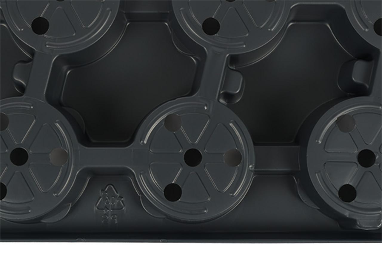 Čierne transportné pláto Modiform 3588 Normpack 488 pre 8 ks okrúhlych kvetináčov s priemerom 12 cm. Každá bunka je na dne opatrená 4 dierami s priemerom 12 mm pre bezpečný odtok vody.